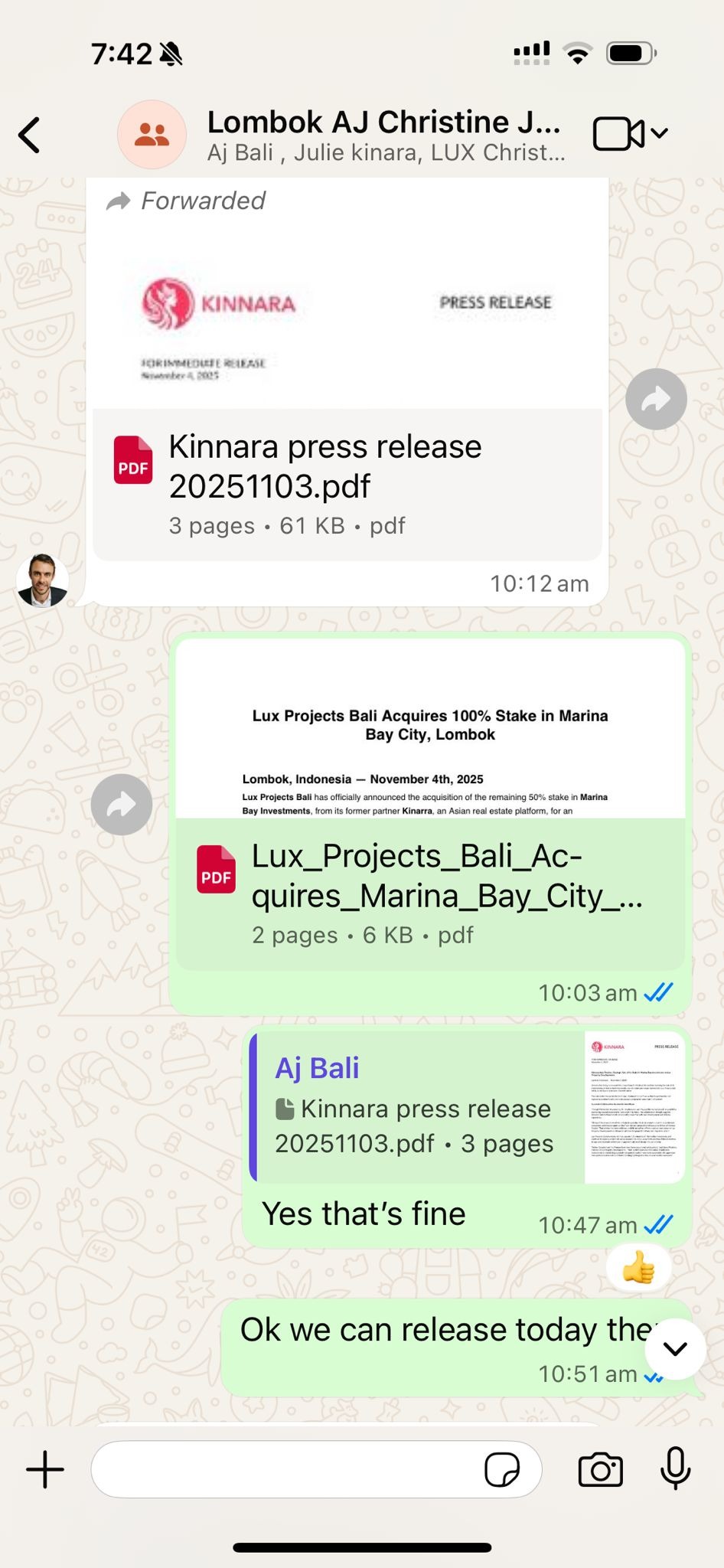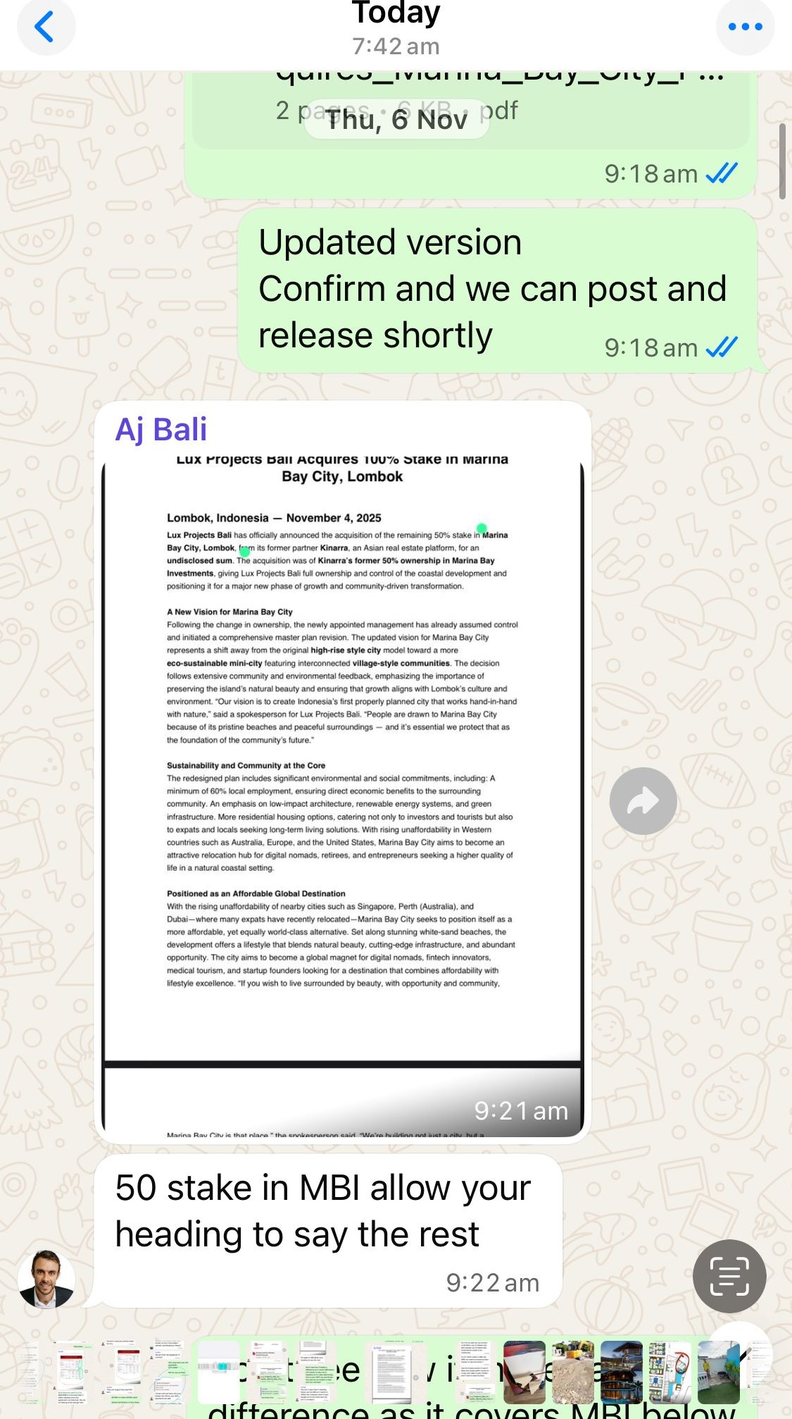 Lux Projects Bali issues a formal media release announcing it has acquired full control of Marina Bay City, following the buyout of its former partner, KINNARA.